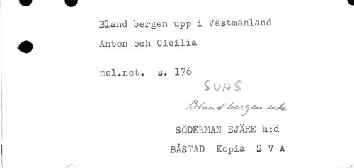 //// Bland bergen upp i Västmanland //// - //// ^^ Anton och Cicilia //// mel.not. s. 176 //// SÖDERMAN BJÄRE h:d //// BÅSTAD Kopia SVA //// ! ^ //// /