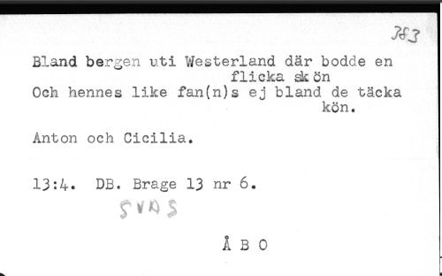 //// Bland bergen uti Westerland där bodde en //// flicka skön //// Och hennes like fan(n)s ej bland de täcka //// kön. //// Anton och Cicilia. //// 13:4. DB. Brage 13 nr 6. //// a ////