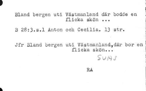 //// Bland bergen uti Västmanland där bodde en ; //// flicka skön ... //// B 23:3.s.l Anton och Cecilia. 13 str. //// Jfr Bland bergen uti Västmanland,dar bor en //// flicka skön... //// i //// RA //// ä ! ////
