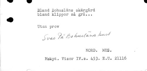 //// } //// Bland Bohuslåns skärgård //// bland klippor så grå... //// < //// Utan prov //// NORD. MUS. //// Mskpt. Visor IV.s. 453. E.U. 21116 ////