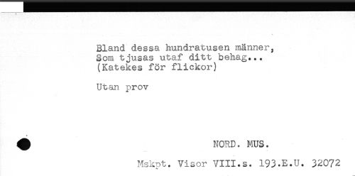 //// * //// Bland dessa hundratusen männer, //// Som tjusas utaf ditt behag... //// (Katekes för flickor) //// Utan prov //// ^ NORD. MUS. //// MskDt. Visor VIII.s. 193-E.U. 32072 ////