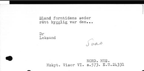 //// Bland forntidens seder //// rätt hygglig var den... //// Dr //// Leksand //// J ^^ //// ^ NORD. MUS. //// Mskpt. Visor VI. s.573* E.U.24331 ////