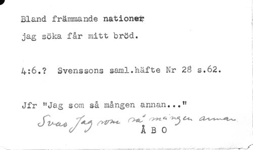 //// Bland främmande nationen //// jag söka får mitt bröd. //// < //// t //// 4:6.? Svenssons saml.häfte Nr 28 s.62. //// } //// Jfr "Jag som så mången annan..." //// y ÅBO ////