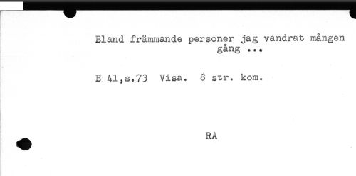 //// Bland främmande personer jag vandrat mången //// gång ..* //// [k //// B 41,s.73 Visa. 8 str. kom. //// t //// ^ RÅ ////
