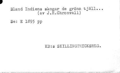 //// Bland Indiens skogar de gröna tjäll... //// (av J.H.Chronvall) //// Se: E 1895 pp //// i //// KB:s SKILLINGTRYCKSREG. ////