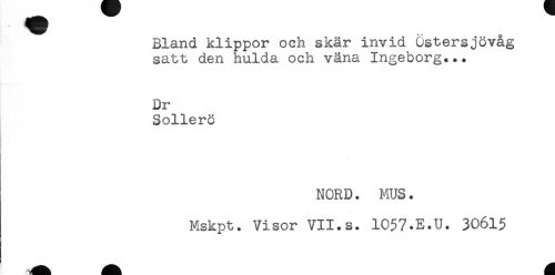 //// Bland klippor och skär invid östersjövåg //// satt den hulda och väna Ingeborg... //// Dr //// Sollerö //// NORD. MUS. //// Mskpt. Visor VII.s. 1057.E.U. 30615 ////