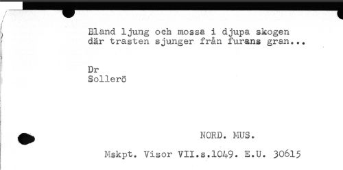 //// //// /Bland ljung och mossa i djupa skogen //// där trasten sjunger från furans gran... //// Dr //// Sollerö //// i //// ! //// ! //// ^ NORD. MUS. //// Mskpt. Visor VII.s.1049. E.U. 30615 //// * ////