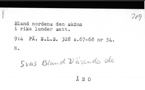 //// Bland nordens den sköna //// i rika lunder satt. //// 9:4 PÄ. S.L.S. 328 s.67-68 nr 54. //// N. ////