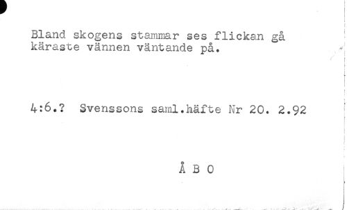 //// Bland skogens stammar ses flickan gå //// käraste vännen väntande på. //// //// /* //// f //// 4:6.? Svenssons saml.häfte Nr 20. 2.92 ' //// ! //// : ////