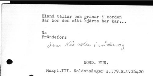 //// Bland tallar och granar i norden //// där bor den mitt hjärta har kär... //// Ds //// Frändefors //// ] //// i //// t //// # NORD. MUS. //// Mskpt.IIl. Soldatsånger s.579.E.U.26420 ////