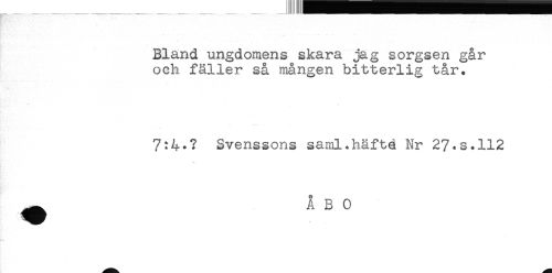//// Bland ungdomens skara jag sorgsen går //// och fäller så mången bitterlig tår. //// 7:4*? Svenssons saml.häfte Nr 27*s.112 //// ^ ÅBO ////