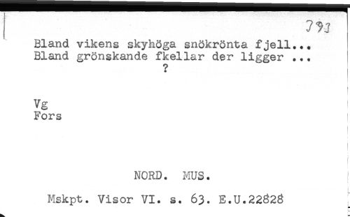 //// 7?J //// Bland vikens skyhöga snökrönta fjell... //// Bland grönskande fkellar der ligger ... //// ? //// Vg //// Fors t //// NORD. MUS. //// t //// i //// Mskpt. Visor VI. s. 63. E.U.22323 ////