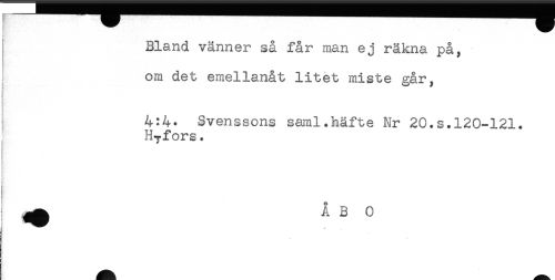 //// Bland vänner så får man ej räkna på, //// om det emellanåt litet miste går, //// ! //// 4:4. Svenssons saml.häfte Nr 20.s.120-121. //// Hyfors. //// i //// j ////