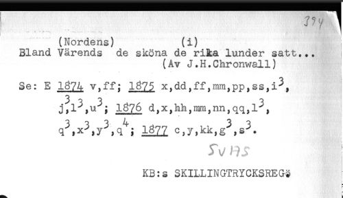 //// < ** //// - -- ^ -- ... ' - , . ^ ' ! //// (Nordens) (i) //// Bland Värends de sköna de rHa lunder satt... //// (Av J.H.Chronwall) //// - - * //// Se: E 1374 v,ff; 1375 x,dd,ff,mm,pp,ss,i^^ //// 3 i 3 i //// 132Z ! //// t //// KB:s SKILLINGTRYCKSREG? //// t ////