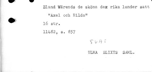 //// jDJLcuiUL wai'<=!iius ue ict ut^jK i*jma. u b. //// "Axel och Hilda" //// 16 str. //// 11482, s. 857 //// } ULMA BLIXTS SAML. ////