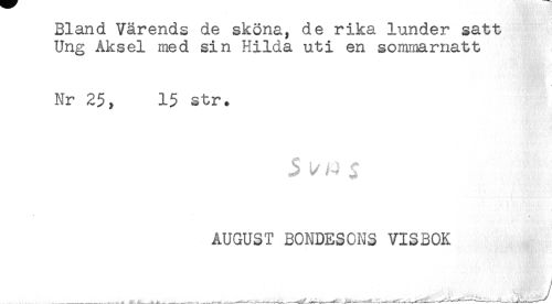 //// JDJL3H1U V ctl MI1U.3 UM ii JK- , U ti I JL.K.<3. J. UI1U<3I' R<3. U U //// Ung Aksel med sin Hilda uti en sommarnatt //// Nr 25, 15 str. //// 3 ^^ ^ //// AUGUST BONDESONS VISBOK //// ....... ////