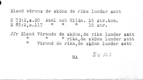 //// Sland värens de sköna de rika lundar satt //// B 73:2,s.20 Axel och Hilda. 16 str.kom. //// B 35:2,s.117 " " " 16 str. //// Jfr Bland Värends de sköna,de rika lunder satt //// ^ ^ " rika,de sköna lunder satt //// " Värend de rika,de s^Öna lunder satt //// RA -S^Ri ////