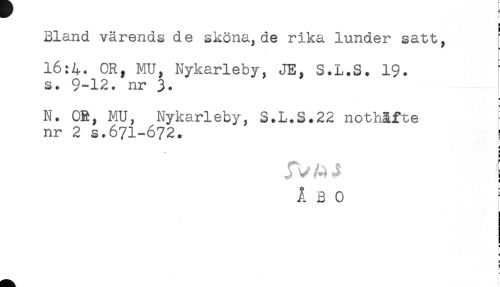 //// Bland värends de sköna,de rika lunder satt, //// 16:4. OR, MU, Nykarleby, JE, S.L.S. 19. //// s. 9-12. nr 3. //// a //// i //// N. OR, MU, Nykarleby, S.L.S.22 nothäfte //// nr 2 s.671-672. ! //// i //// Pv ^ J- } //// ÅBO = //// - //// - //// E //// å ////