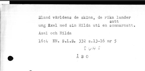 //// '-..-y- . ' .... - * //// - //// Bland världens de sköna, de rika lunder //// satt //// ung Xxel med sin Hilda uti en sommarnatt. //// Axel och Hilda //// 16:4 EN. S.L.S. 332 s.13-16 nr 5 ////
