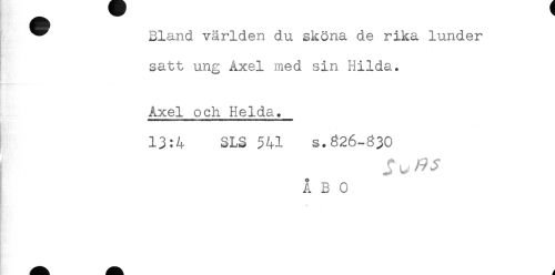 //// ^ Bland världen du sköna de rika lunder //// satt ung Axel med sin Hilda. //// iHWfMMAtt) < ——- - - - //// Axel och Helda. //// 13:4 SLS 541 s.826-330 //// Å B 0 //// - ////