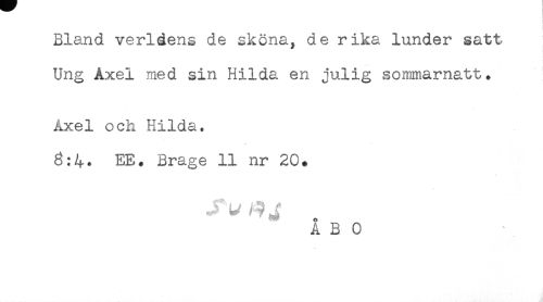 //// Bland världens de sköna, de rika lunder satt //// Ung Axel med sin Hilda en julig sommarnatt. //// Axel och Hilda. //// EB. Brage 11 nr 20+ //// A B 0 ////