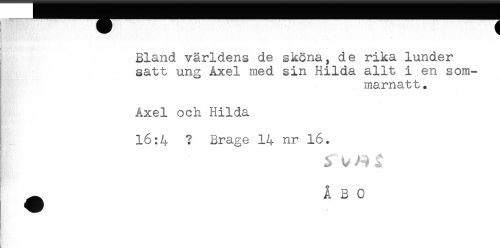 //// v 1 //// Bland världens de sköna, de rika lunder //// satt ung Åxel med sin Hilda allt i en som- //// marnatt . //// - //// . //// Axel och Hilda //// 16:4 ? Brage 14 nr 16. //// ^ ÅBO ////
