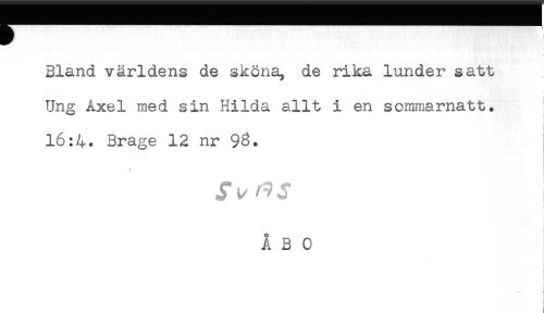 //// K //// Bland världens de sköna, de rika lunder satt //// Ung Axel med sin Hilda allt i en sommarnatt. //// 16:4. Brage 12 nr 93. //// * //// ÅBO //// - ti //// t ////
