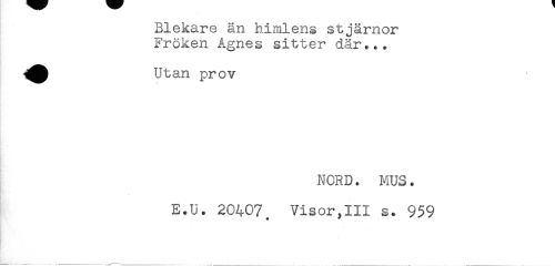 //// blekare an himlens stjärnor //// Fröken Agnes sitter där... //// Utan prov //// NORD. MUS. //// E.U. 20407, Visor,III s. 959 ////