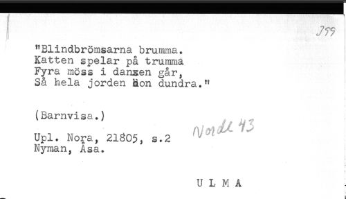 //// ^Blindbrömsarna brumma. //// Katten spelar på trumma //// Fyra möss i dansen går, //// Så hela jorden Ron dundra." //// (Barnvisa.) //// Upl. Nora, 21805, s.2 //// Nyman, Asa. //// U L M A ////