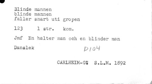 //// Blinde mannen //// blinde mannen //// faller snart uti gropen //// 123 1 str. kom. //// i //// ! //// 1 //// Jmf En halter man och en blinder man //// Danslek p //// CÅRLHEIM-G3 S.L+M+ 1892 //// j ////