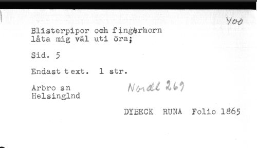//// ! y^ //// Blisterpipor och fing$rhorn //// låta mig väl uti öra; //// Sid. 5 //// Endast text. 1 str. //// Årbro sn //// Helsinglnd //// DYBECK RUNA Folio 186$ ////