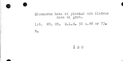 //// Blommorna hava vi plockat och bladena //// hava vi gömt. //// 1:6. MU. OR. S.L.S. 50 s.88 nr 73* //// N. //// ÅBO ////