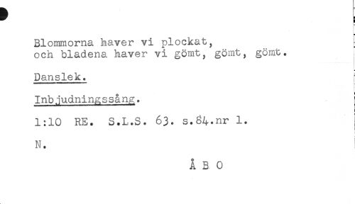 //// i //// Blommorna haver vi plockat, L //// och bladena haver vi gömt, gömt, gömt. //// Danslek. //// Inb judninR s så ng. //// 1:10 RE. S.L.S. 63. s.84-nr 1. //// N. ////