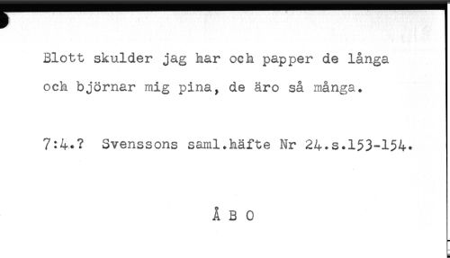 //// Blott skulder jag har och papper de långa //// och björnar mig pina, de äro så många. //// 7:4.? Svenssons saml.häfte Nr 24.s.153-154. //// s ////
