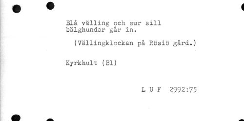 //// Blå välling och sur sill //// bälghundar går in. //// (Vällingklockan på Rosiö gård.) //// r //// Kyrkhult (Bl) //// i //// L U F 2992:75 ////