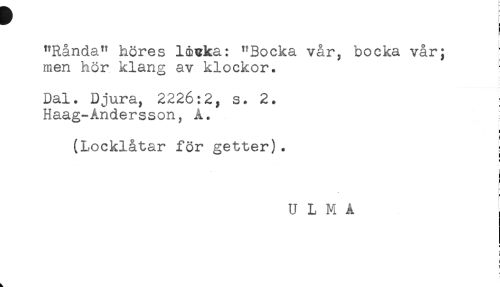 //// F //// "Rånda" höres léuka: ^Bocka vår, bocka vår; //// men hör klang av klockor. - //// Dal. Djura, 2226:2, s. 2. //// Haag-Andersson, A. //// (Locklåtar för getter). j //// r //// U L M A ////