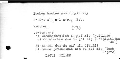 //// Bocken bocken som du gaf mig //// * * - //// Nr 279 a), x 1 str., Esbo //// med.me^* //// Varianter: //// b) Kasabockenden du g af mig (Helsinge) //// c) Getabocken den du gaf mig (Borgå,Liljen //// dal) //// ^ d) Vännen den du gaf mig (Päråå) //// e) Samma getabocken som du gaf mig (Ingå- //// Degerö) //// LAGUS NYLAND< ////