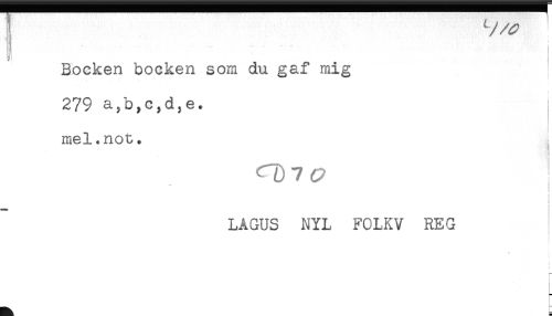 //// g - - - ; ..... //// Bocken bocken som du gaf mig //// 279 a,b,c,d,e. //// mel.not. //// ! //// t //// i //// i //// ! //// LAGUS NYL FOLKV REG //// * ////