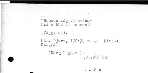 //// *.. . " - - - //// /' T - * - - . * - - T //// "Bocken låg ti brånan //// ?).ad e-bla ti munnen." //// (Vaggvisa). //// Tt^* ^ * //// Dal. pjura, 190:3, s. $l6:o). //// I Dalgråd.- //// (Därg^l göken). //// ^ W ti ^ ^ C //// U L M A ////