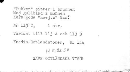 //// "Bukken" sitter i brunnen //// Med gulIblad i munnen //// Kera goda "huejta" Gasf i //// ! //// Nr 113 C, 1 str. //// Variant till 113 A och 113 B //// Fredin Gotlandstoner, Nr 144 //// t //// < //// < //// SÄVE GOTLÄNDSKA VIS(R //// ^..... _ t A \ ' .' .1? t . t ' ; , . , ^ - . J " ////