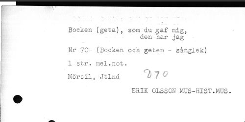//// -g-——* - - t—-i t ^ — —^ - — * — —- //// " . - * //// * - ^ ...t - .... . //// * — ^ w —-*. — < //// Bocken (geta) , som du gaf mig, //// j - - den har jag //// AS*. - ^ //// Nr 70 (Bocken och geten - sånglek) //// 1 str. mel.not. //// Mörsil, Jtlnd ^ ^ //// ^ ERIK OLSSON MUS-HIST.MUS. ////