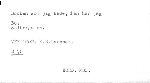 //// Bocken som jag hade, den har jag //// Bo. //// Solberga sn. //// \ //// VFF 1062. K.H.Larsson. //// D 70 //// NORD. MUS. ////
