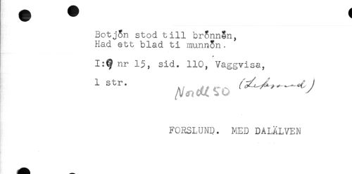 //// Botjon stod till bronngn, //// Had ett blad ti munnSn. //// 15, sid. 110, Vaggvisa, //// I str. / yfLy^^^ ^ //// /FORSLUND. MED DALÄLVEN ////