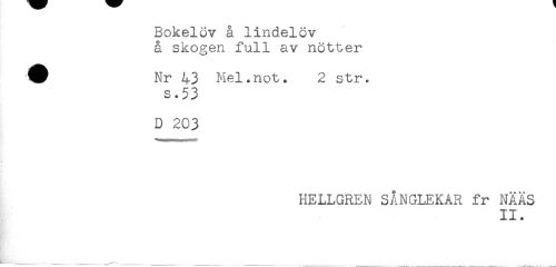 //// Bokelöv å lindelöv //// å skogen full av nötter //// W Nr 43 Mel.not. 2 str. //// s.53 //// D 203 //// HELLGREN SÅNGLEKAR fr NÄÄS //// II. //// *___ ___ _____.... ... ... ////