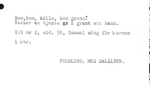 //// Bom,bom, kolla, kom grannf //// Vacker en tjosta g^ a grant ett band. //// 1:9 nr 2, sid. 56, Gammal sång för b amen //// 1 str. //// FORSLUND. MED DALÄLVEN. ^ //// } ////