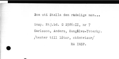 //// Bom uti Stalla den r^delige man... //// insp. Rtj.bd. G 2$g6:II, nr 7 //// Karlsson, Änders, Kungålvs-rYtterby. //// /texter till låtar, skämtvisor //// /RÅ INSP. ////