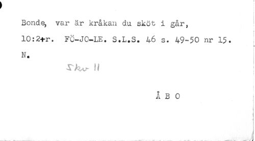 //// Bonde, var är kråkan du sköt i går, //// 10:2+r. Fö-JC-LE. S.L.S. 46 s. 49-50 nr 15. //// N. //// i ^ //// ÅBO //// ^ . ..... ..... . . .. j ////