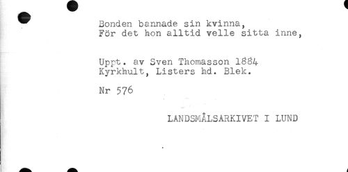 //// * Bonden bannade sin kvinna, //// För det hon alltid velie sitta inne, //// Uppt. av Sven Thomasson 13^4 //// Kyrkhult, Listers hd. Blek. //// Nr 576 //// LANDSMÅLSARKIVET I LUND ////