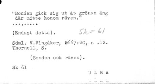 //// "Bonden gick sig ut åt grönan äng //// där mötte honom räven." I //// r //// ^ - : //// (Endast detta). .M * ^ //// Sdml. V.Vingåker, 966?:20, s .12. //// Thornell, S. //// < //// (Bonden och räven). //// Sk 61 //// U L M A ////