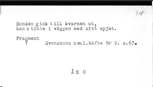 //// t y/^ //// . //// Bonden gick till kvarnen ut, //// han s tötte i väggen med sitt spjut. //// Fragment //// ? Svenssons saml.häfte Nr 9* s.67v //// ! ////